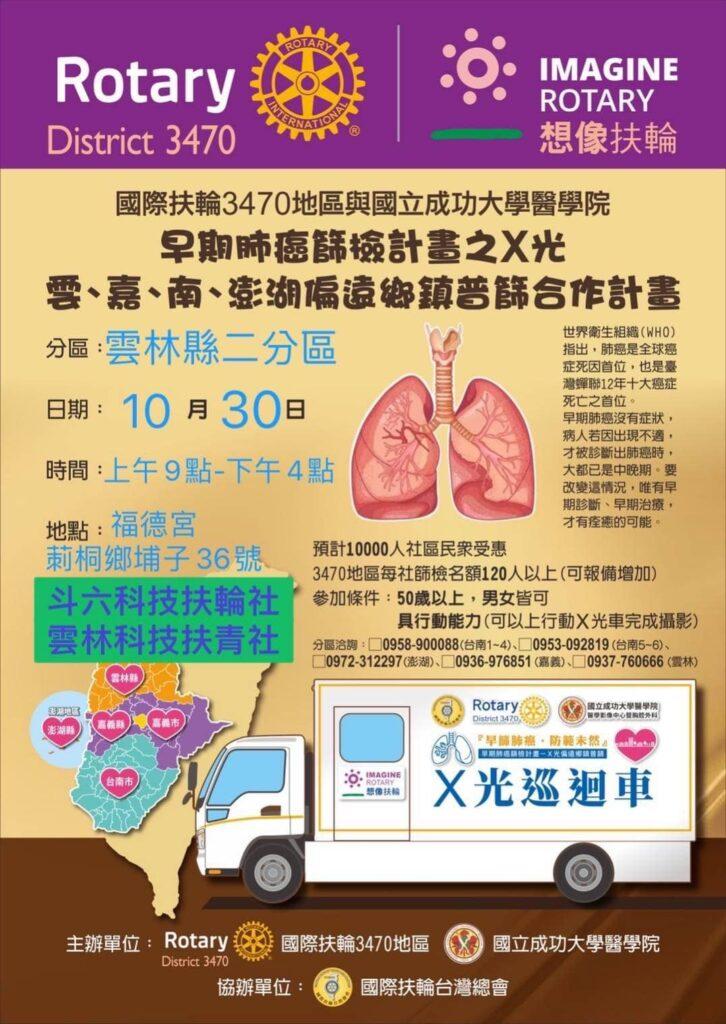 斗六科技扶輪社與雲林科技扶青社聯合主辦–肺癌篩檢活動日期:10/30日(週日)時間:09:00-1
